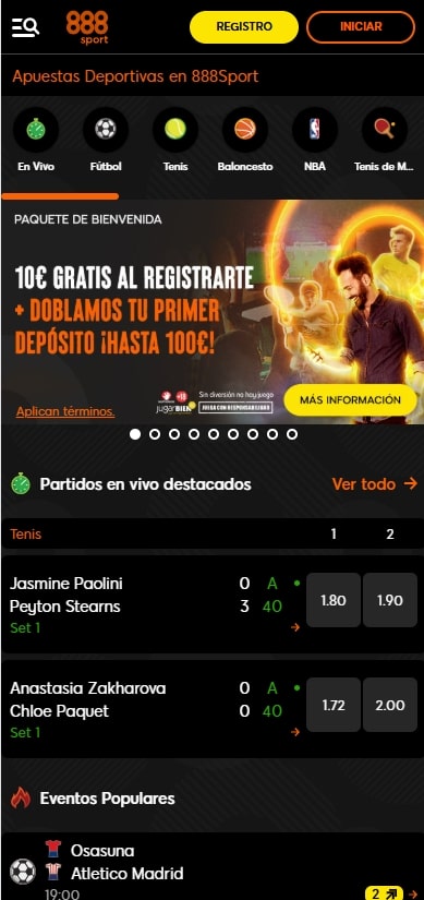 En la parte superior, la plataforma ofrece acceso rápido a eventos deportivos destacados y populares como la Liga, Champions, NBA o torneos de tenis de Grand Slam. También hay un enlace visible a 888Casino y 888Poker, casinos online del mismo grupo que operan de forma independiente. A la izquierda de la pantalla, puedes acceder a mercados en vivo, eventos próximos y promociones, además de una lista desplegable con todos los deportes disponibles. Los eventos más populares y las competiciones que generan más apuestas también están agrupados en esta sección. Además, 888Sport cuenta con una aplicación móvil que permite apostar desde cualquier dispositivo con la misma comodidad y rapidez que en su versión web.